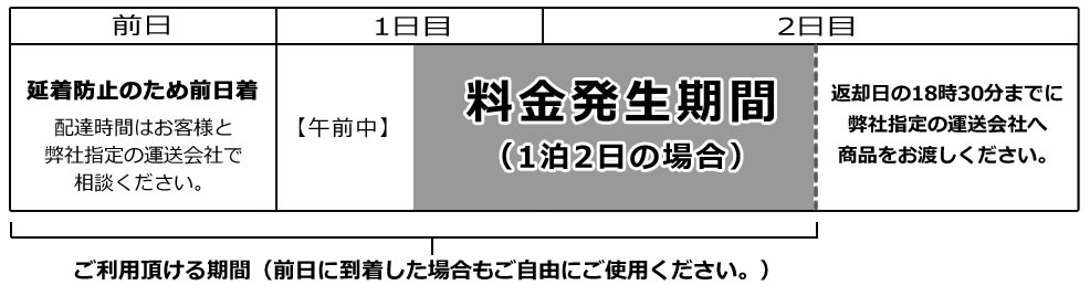 商品の延着防止の為、レンタル開始日の前日15時までにお届けとなるよう手配しております。(着時間のご指定は承っておりません。商品発送後に「お問い合せ送り状No.」をお送りいたしますので直接、運送会社とお時間のご相談をお願いいたします。)前日着の分のレンタル料金はいただいておりません。前日届きましたら、そのままご使用いただいて問題ございません。