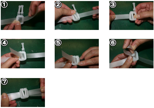 ※上段の写真1~3の順番に片側を留めて頂き、次に下段写真4~7の順番にもう一方を留めてください。