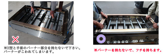 バーナー部分には衝撃から機械を守る為、バーナーの上に板をのせ、パッキンを敷くことで、荷降ろしの時の衝撃を吸収し、故障を防ぎます。