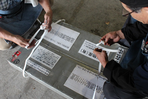 ④箱を閉め、PPバンドを留めます。