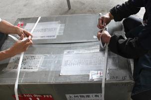 ⑤鉄板の箱はPPバンドを縦2本・横2本留めます。